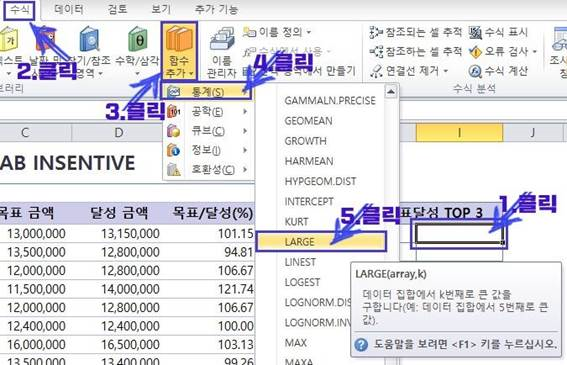 ▼ 값 입력 셀 클릭 → 수식 → 함수 추가 → 통계 → LARGE