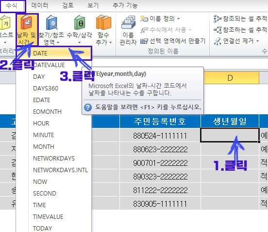아래 예제에서는 주민등록번호 앞 6자리를 생년월일로 옮기는 방법을 DATE 함수로 적용시켜 보도록 하자.