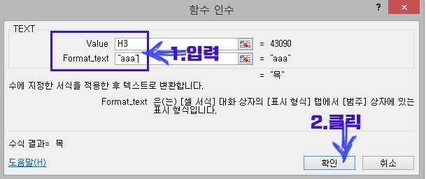 예제) Value: H3 셀 / Format_text: aaa(요일 표시 서식코드)