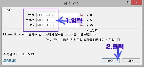 함수 인수 대화상자가 나타나면 YEAR(년) / MONTH(월) / DAY(일)에 각 값을 입력한다.