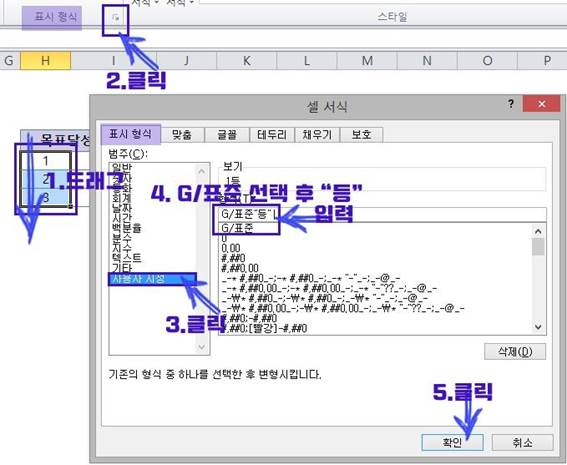 1, 2, 3 드래그 → 홈 → 표시형식 옆 화살표 → 사용자 지정 → G/표준 선택 → “등” 입력 후 확인