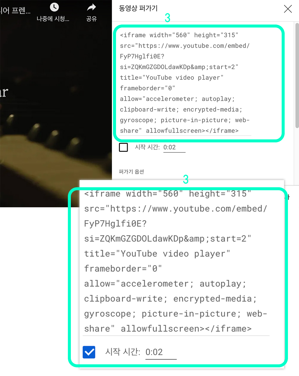 : 시작 시간 선택하는건 덬의 필요에 따라 다른 사항이고, 동영상 퍼가기 내용부분 전체 복사하면 돼