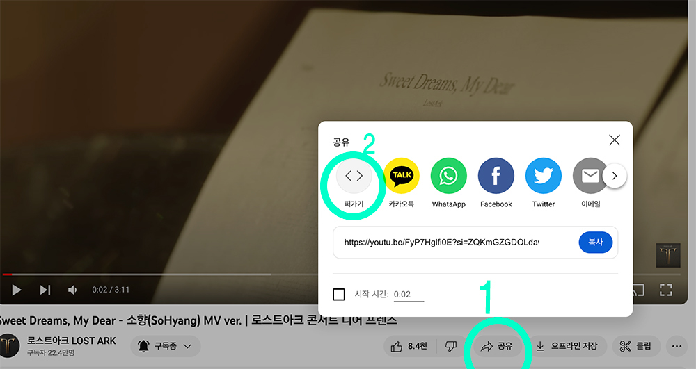 1) 공유버튼(공유하고자하는 웹사이트 링크주소) 클릭 → 퍼가기 클릭