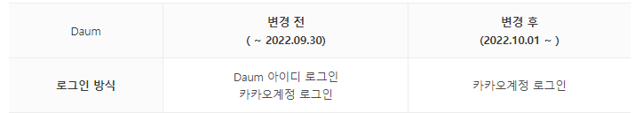 2022월 10월 1일부터 Daum 로그인 방식이
